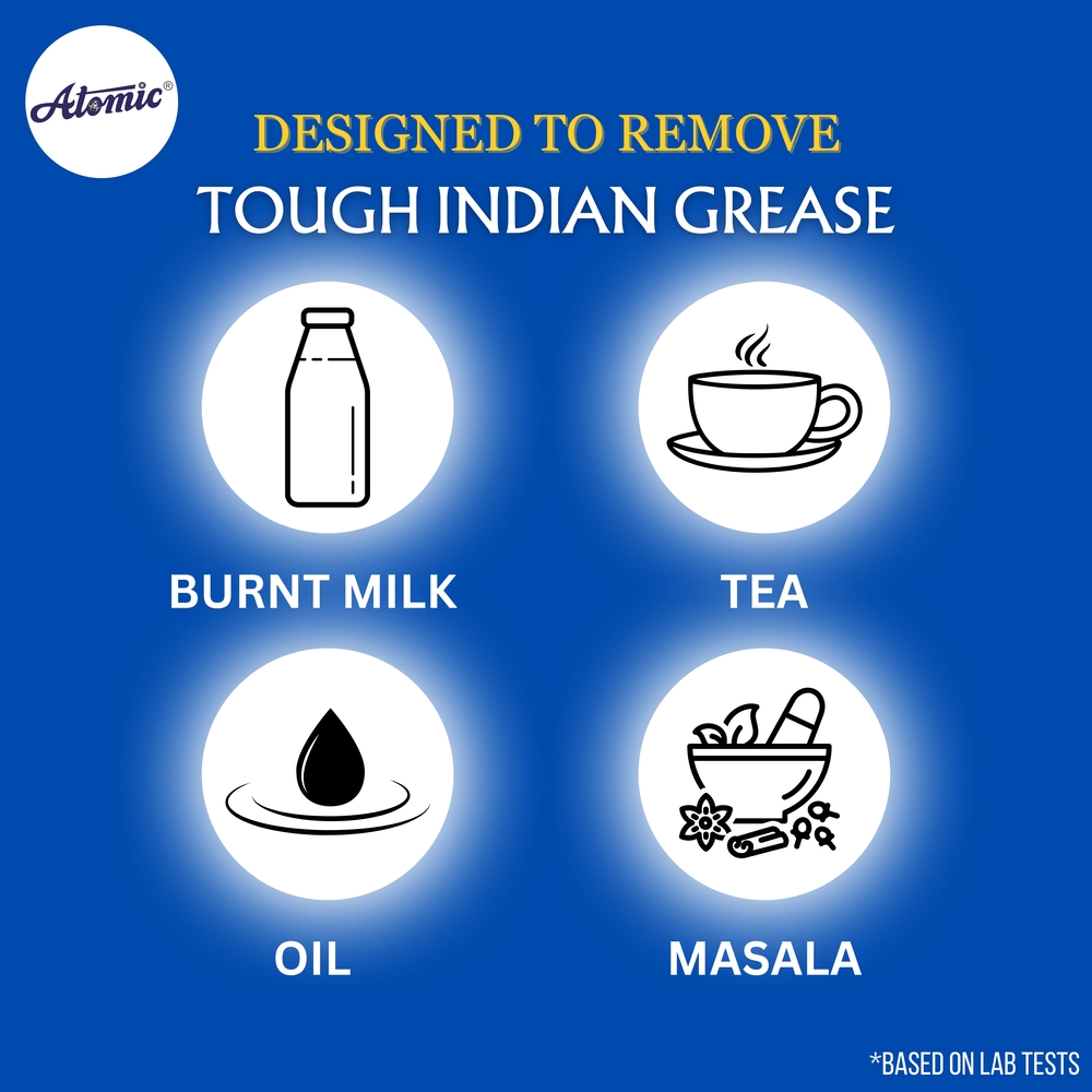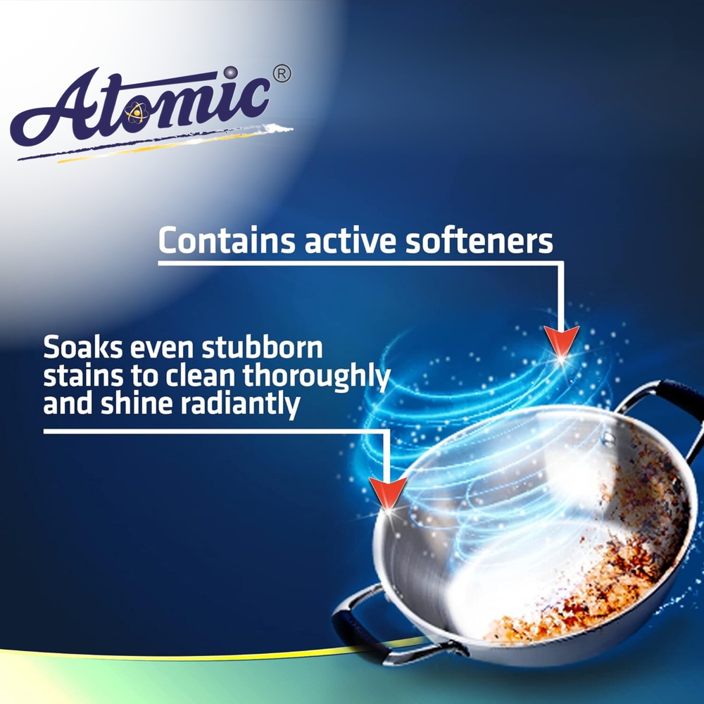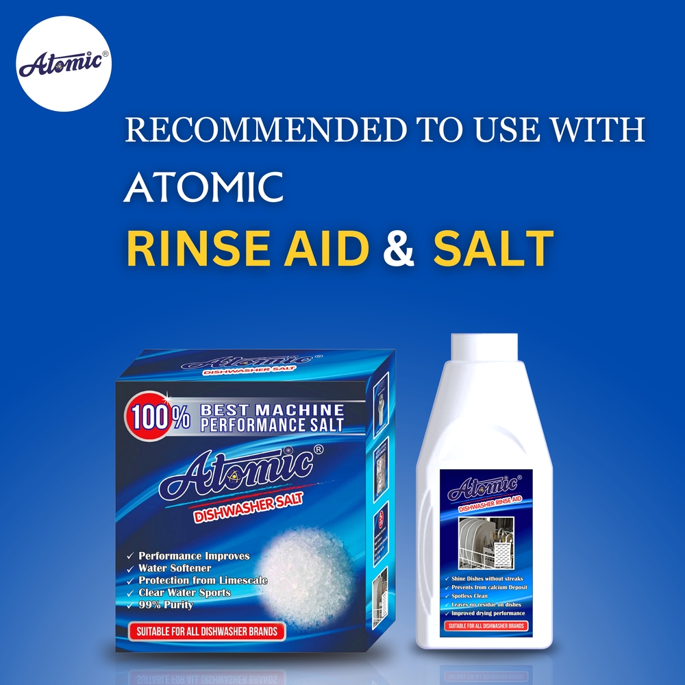 Ensure sparkling clean, streak-free dishes every time with ATOMIC Dishwasher Detergent Powder 900gm. Specially formulated with powerful grease-cutting agents and stain-removing enzymes, this detergent tackles tough food residues, tea and coffee stains, and baked-on grime with ease. Its advanced formula works in all dishwasher models, delivering spotless results while protecting glassware and cutlery from clouding and corrosion. With a fresh, clean fragrance, it leaves your dishes not only looking pristine but smelling fresh too.