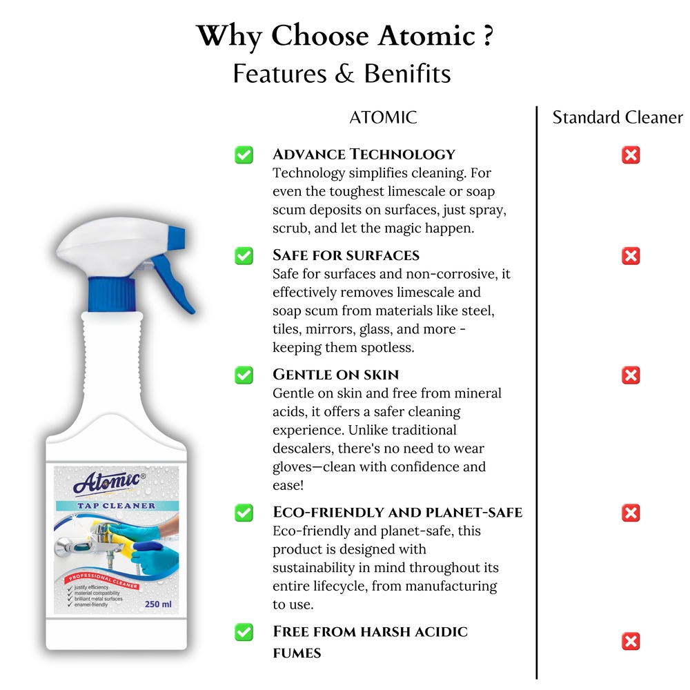 Say goodbye to dull, stained taps and hello to a mirror-like sparkle. ATOMIC Tap Cleaner Liquid is designed to cut through limescale, soap scum, and stubborn hard water marks in minutes. With its powerful yet surface-friendly formula, it restores brilliance to taps, faucets, shower heads, and more—leaving every corner of your bathroom and kitchen spotless and fresh. Easy to use, quick to act, and safe for regular cleaning, it’s the smarter way to keep your fittings gleaming.