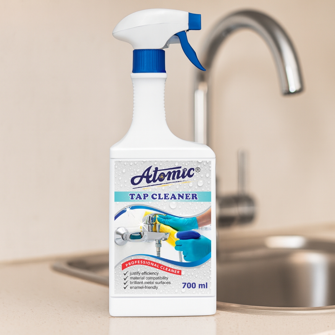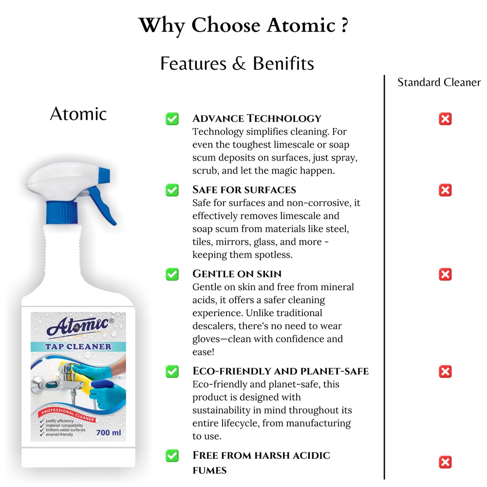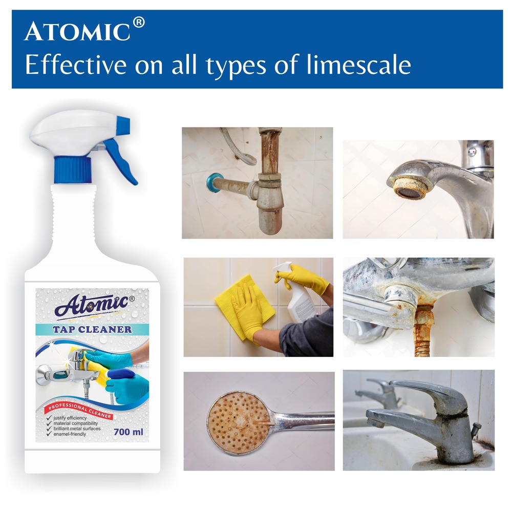 ATOMIC Tap Cleaner Liquid is your all-in-one solution for effortlessly removing tough limescale, hard water stains, soap scum, and grime from taps, faucets, and other fixtures. Its advanced formula restores the original shine of your fittings while being gentle on surfaces and safe for regular use. Leaves your kitchen and bathroom accessories sparkling clean and fresh, making tap maintenance easy and hassle-free.