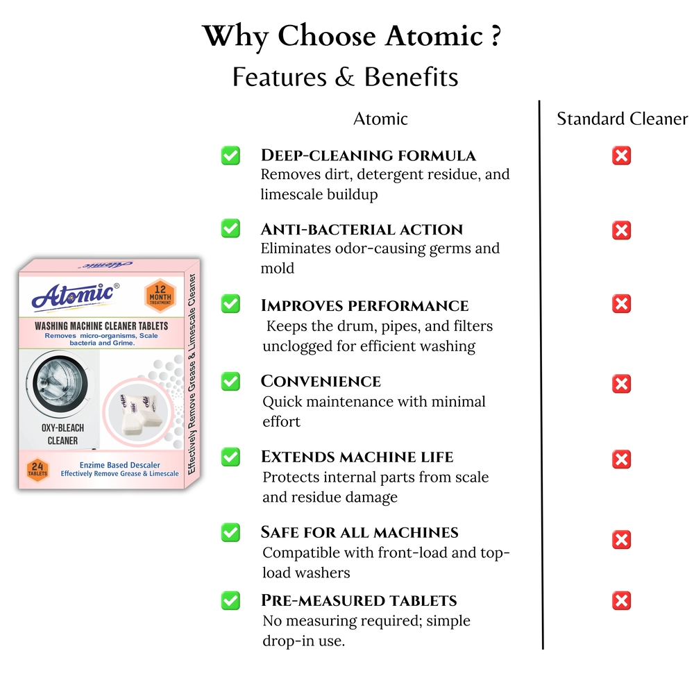 ✨ Keep your washer fresh, efficient, and long-lasting with ATOMIC Washing Machine Descaler Tablets—because clean laundry starts with a clean machine.